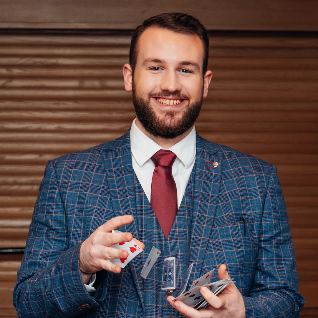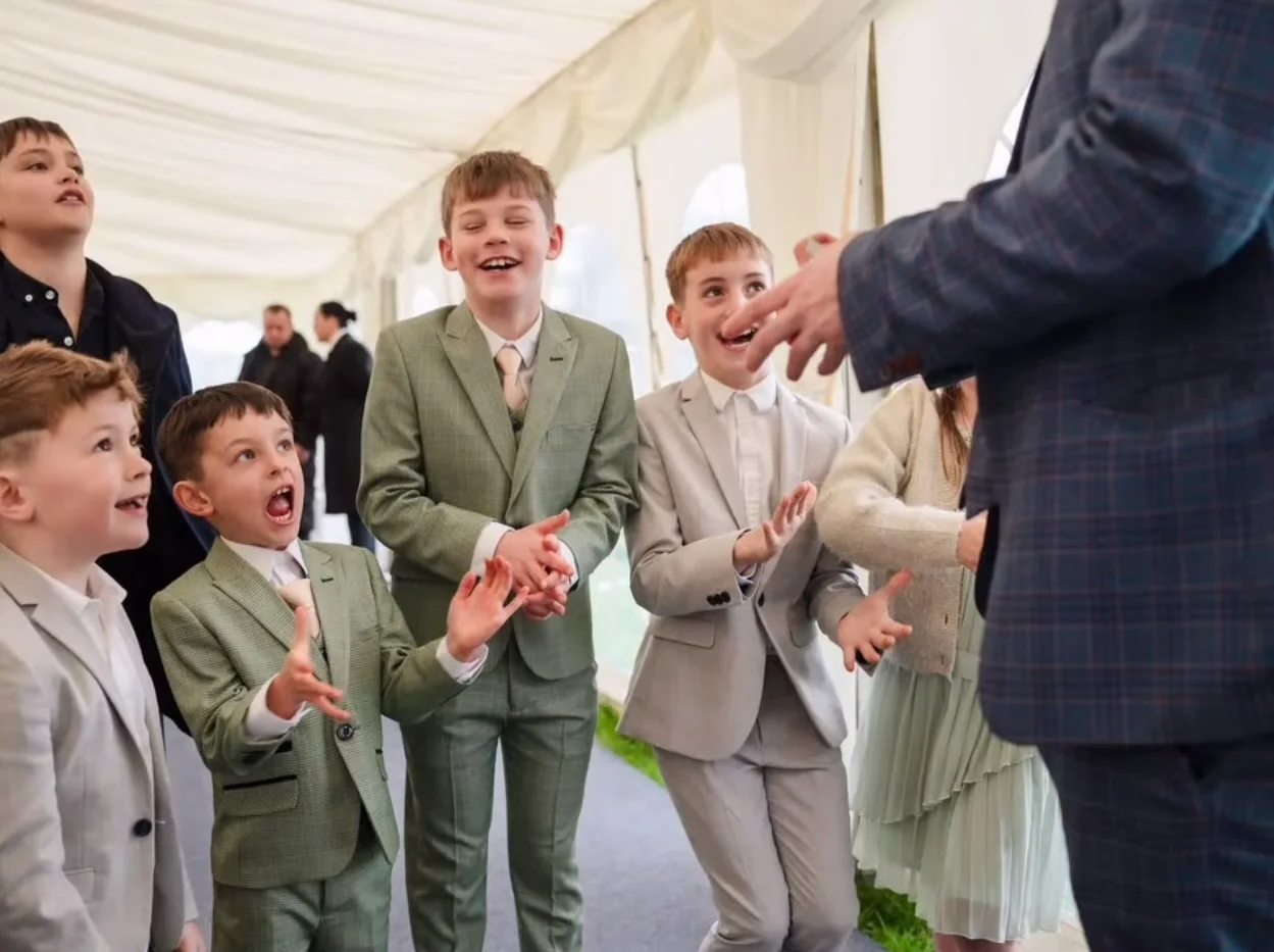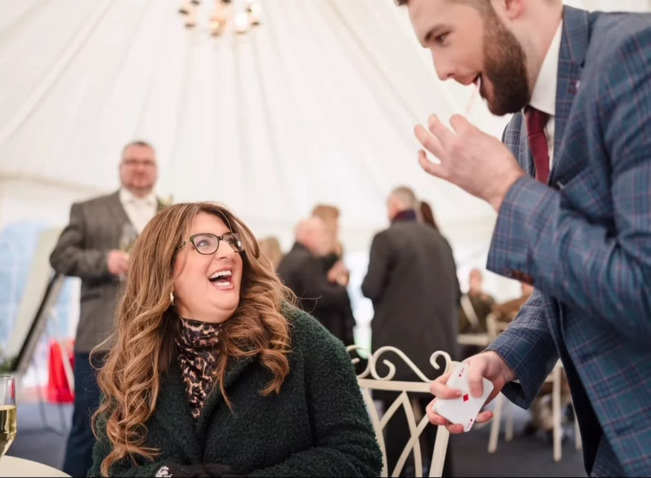 For wedding couples, this means full rooms, natural laughter and genuine reactions during drinks receptions, wedding breakfasts and evening celebrations. He breaks the ice between families, keeps guests entertained during photographs and ensures tables are buzzing between courses. With optional Magic & Hosting packages, he can also manage announcements, coordinate key moments and keep your timeline on track – giving you complete confidence that your day runs smoothly.